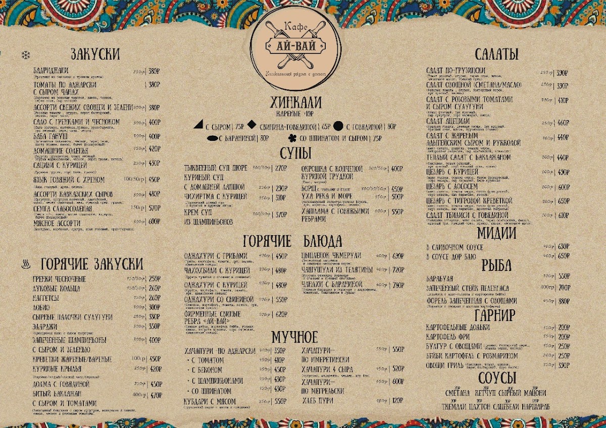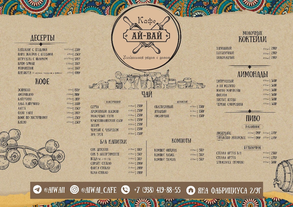 Welcome to Ay-Vay, an intimate café nestled in the heart of Khostinskiy, Krasnodar Krai. This charming spot features an inviting ambiance where every visit feels like joining family around a dining table. The menu is primarily inspired by the vibrant flavors of Georgian cuisine, celebrated for its delicious khinkali, which have captivated locals and visitors alike. Reviewers rave about not only the taste but also the captivating presentation of dishes.